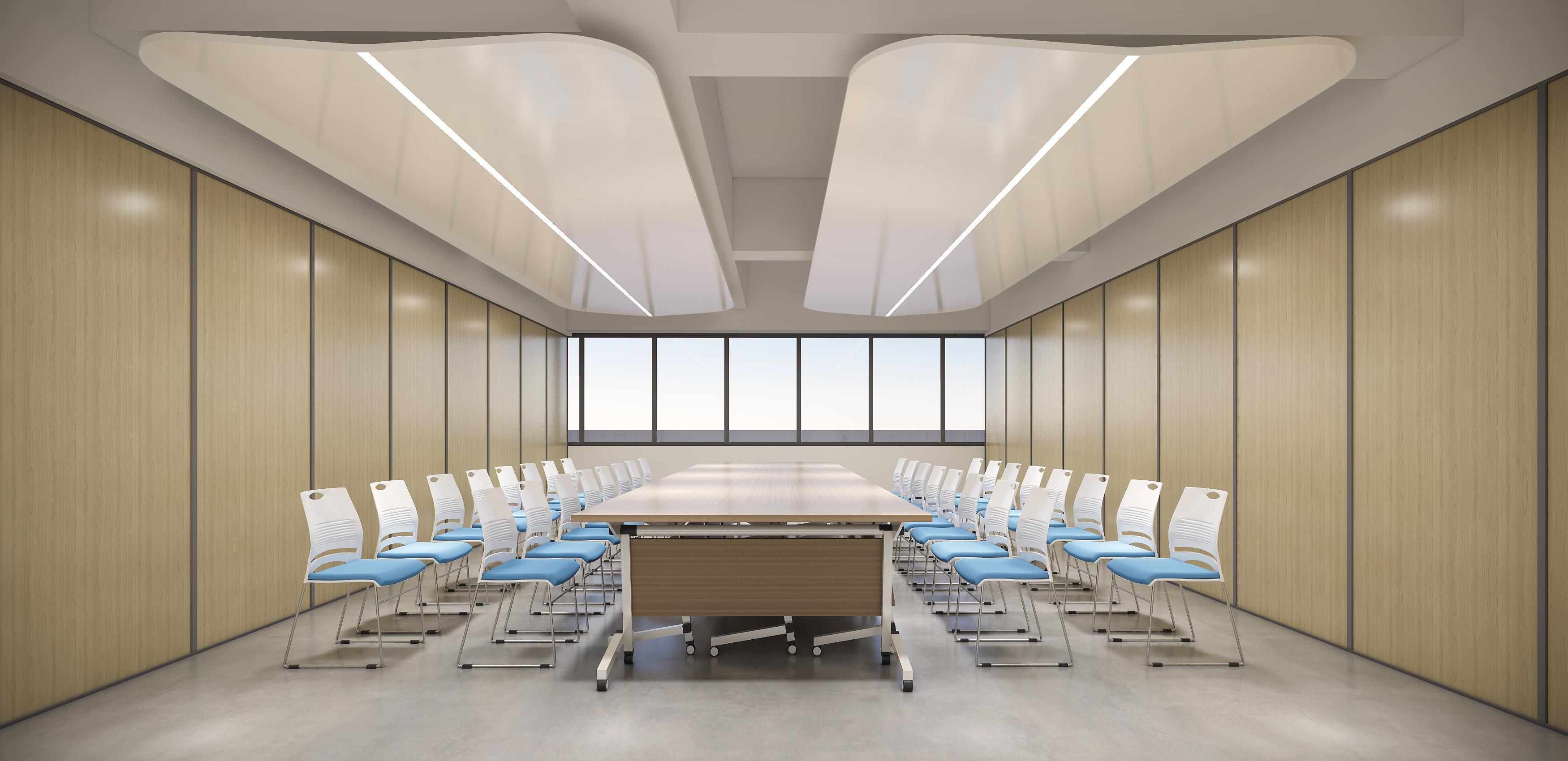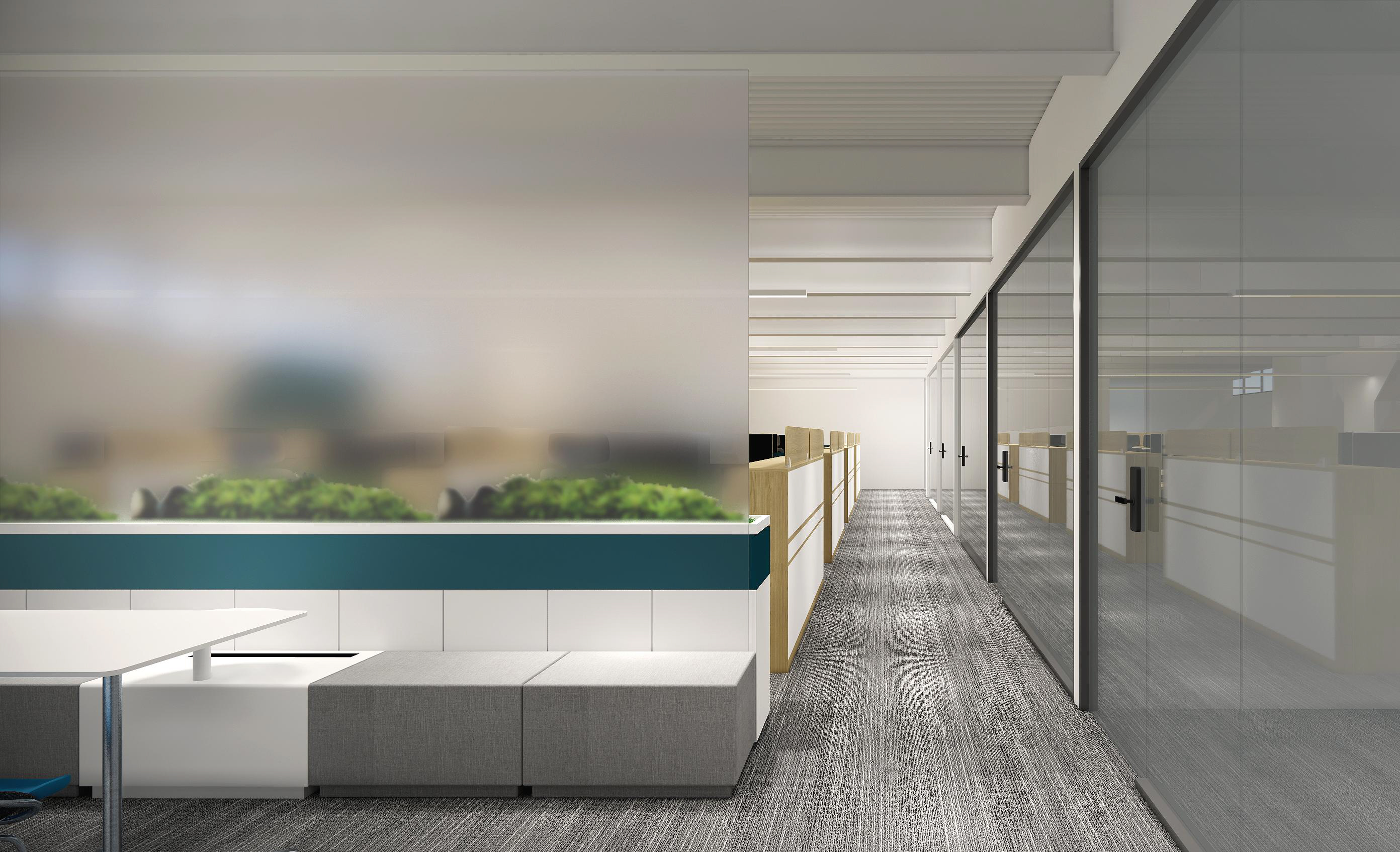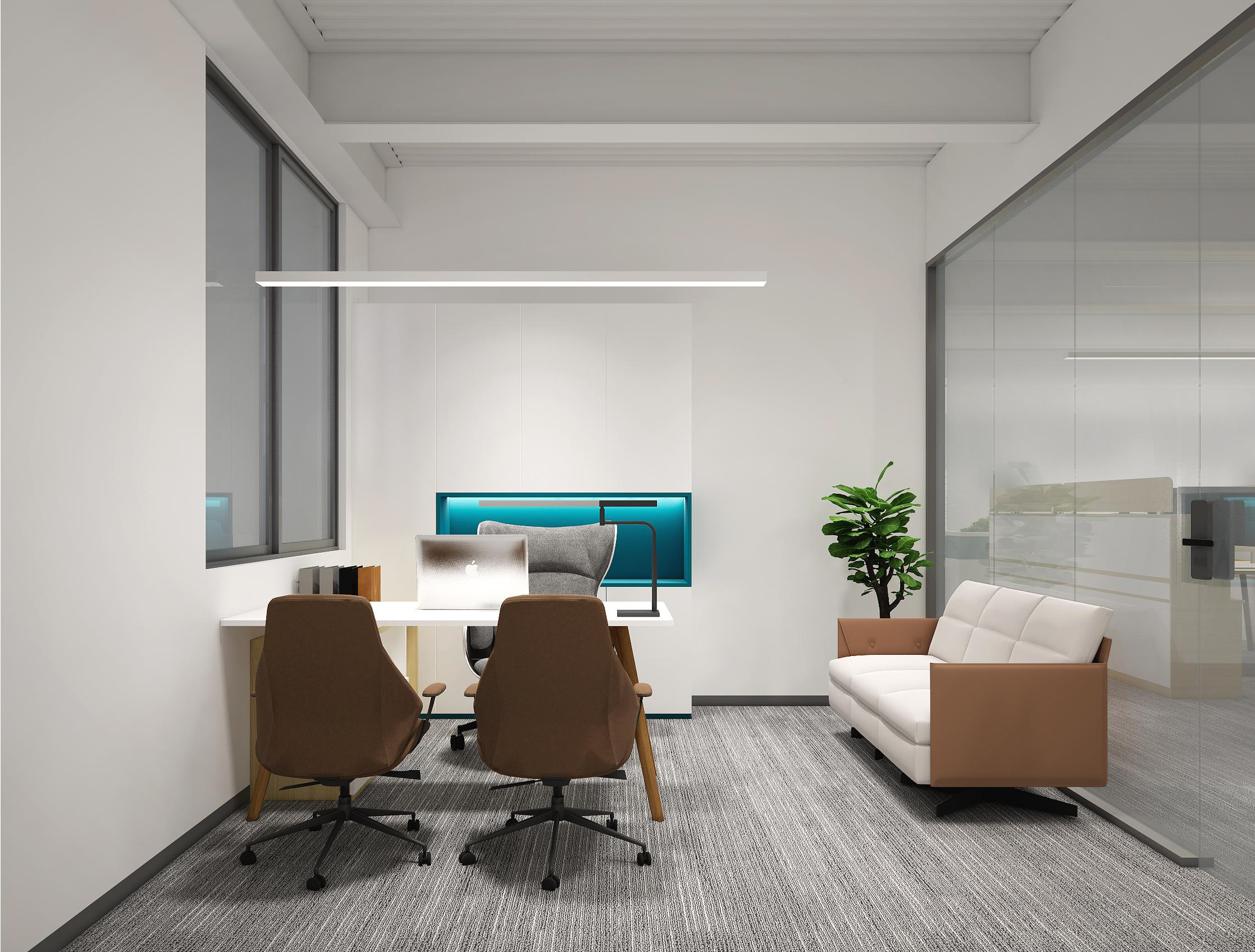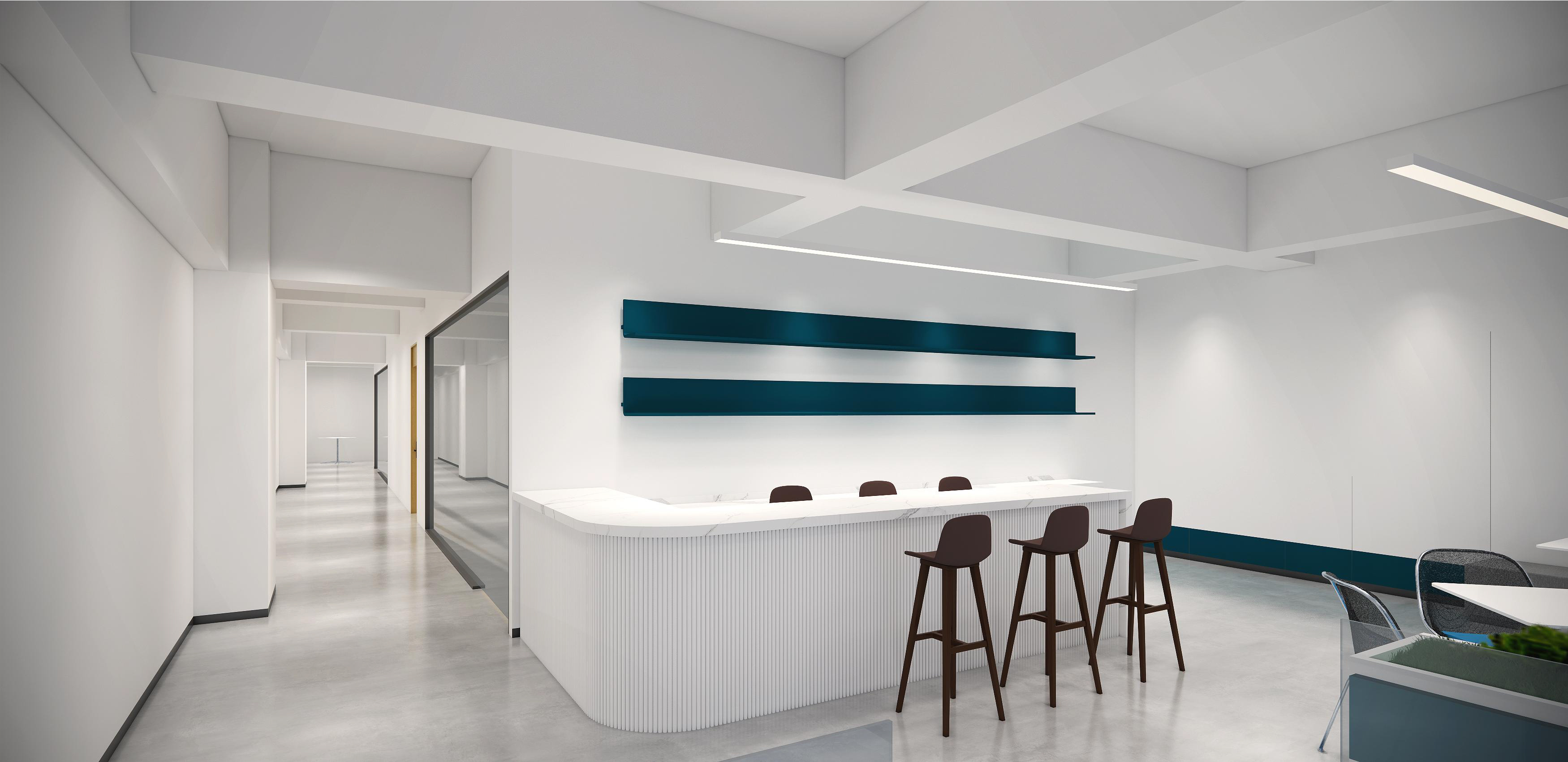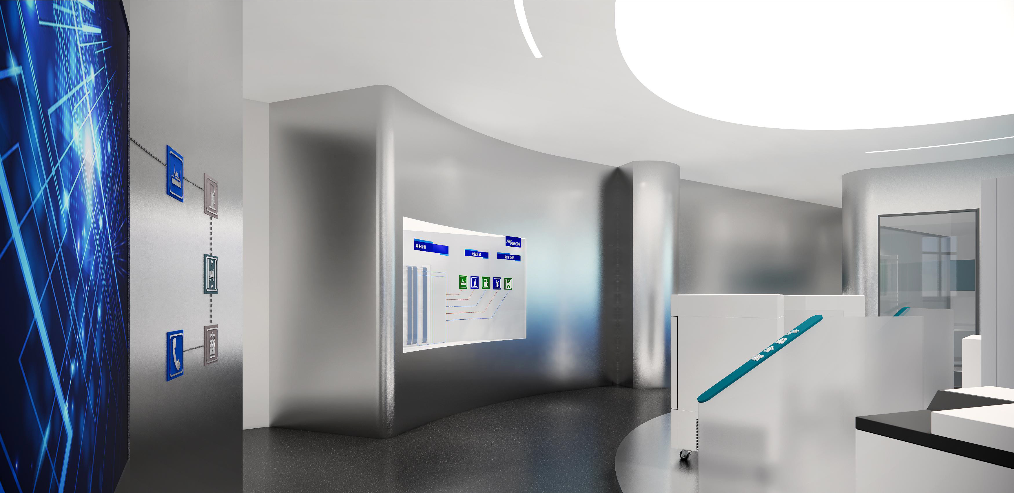 墻面幾何線條的使用,突出現(xiàn)代感,同時增加動感。冷色調墻面強調科技感,開放式布局,空間更加通透、流動。