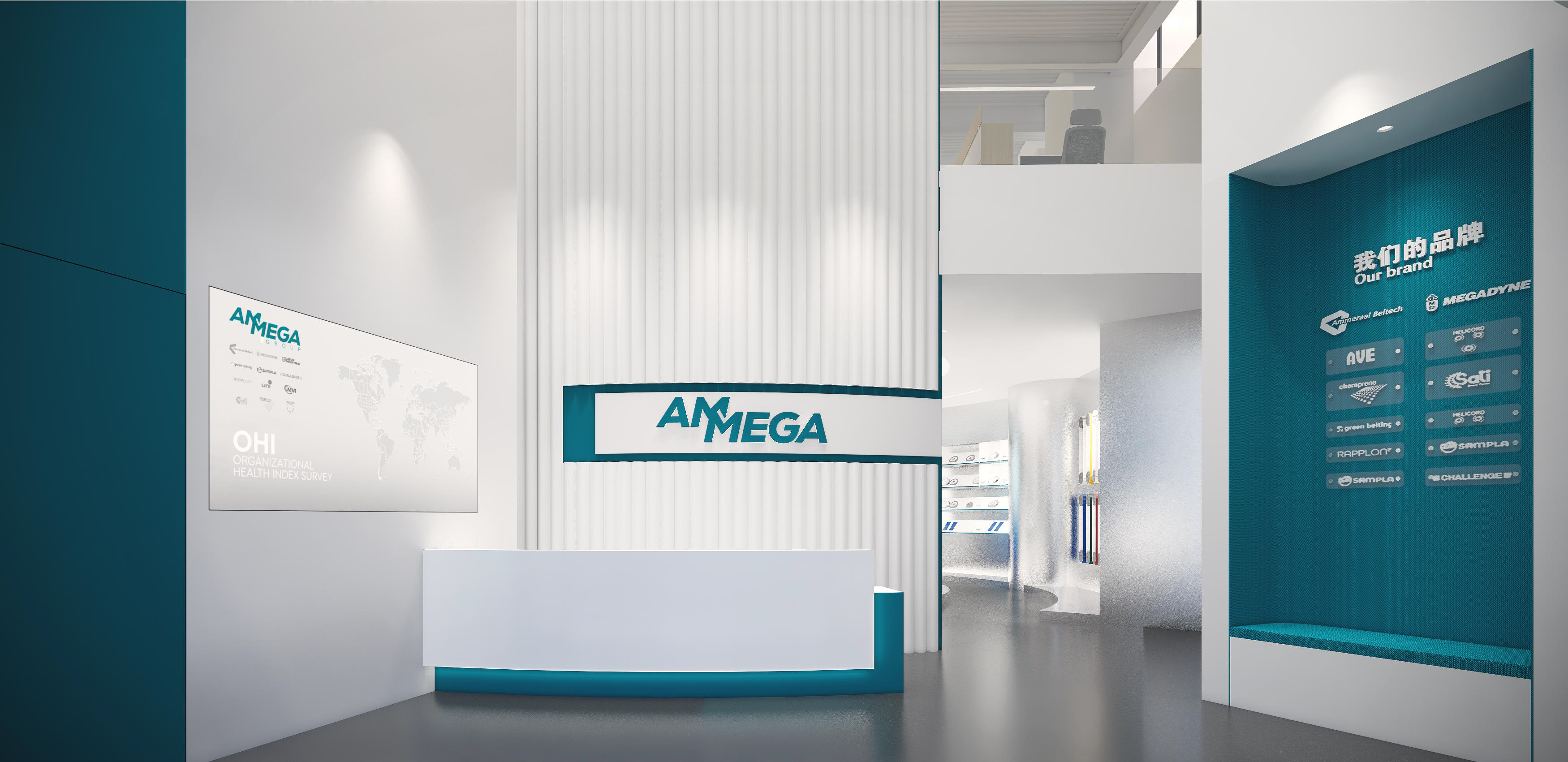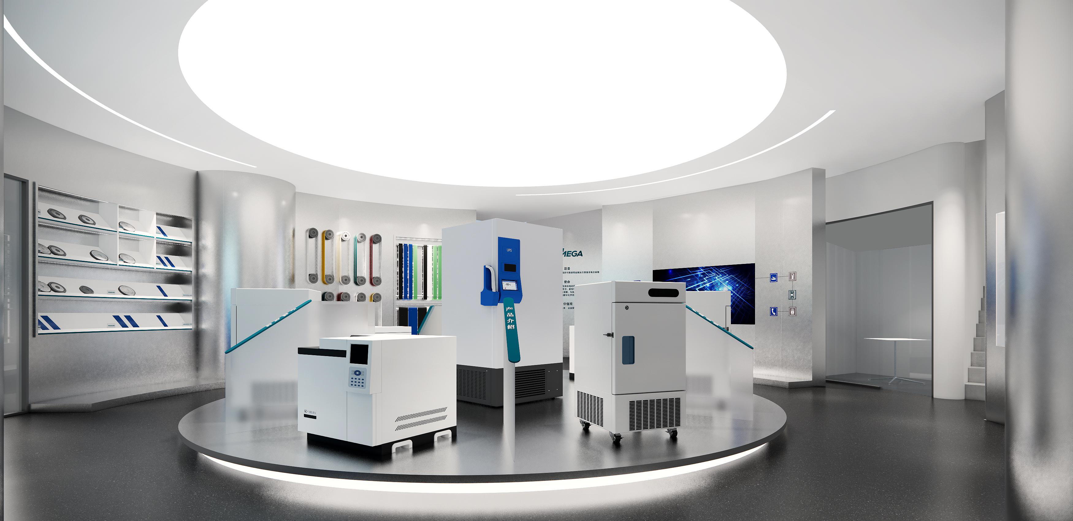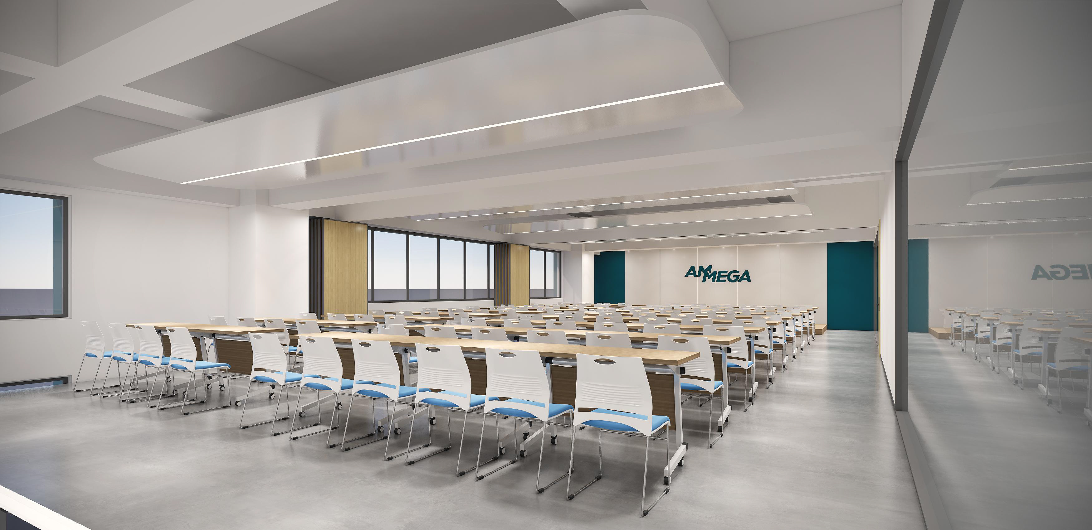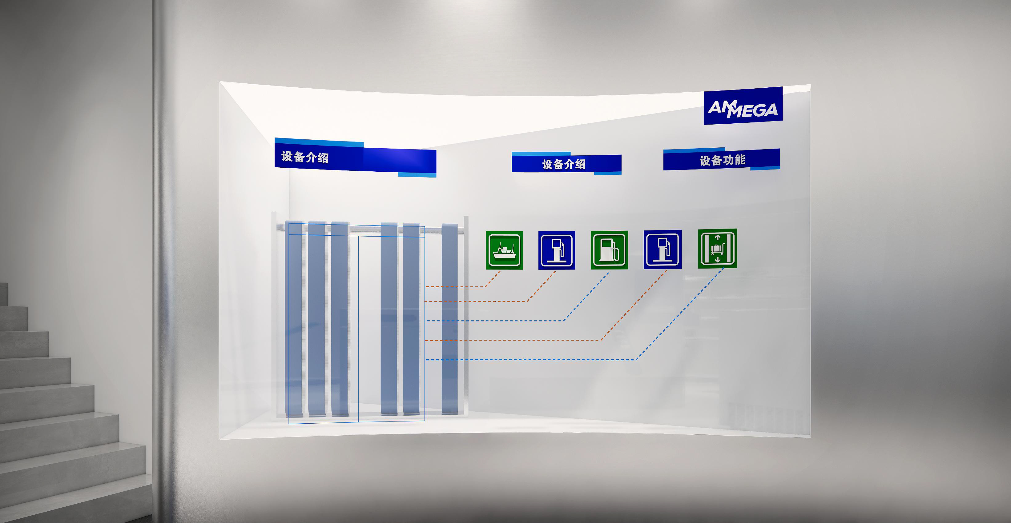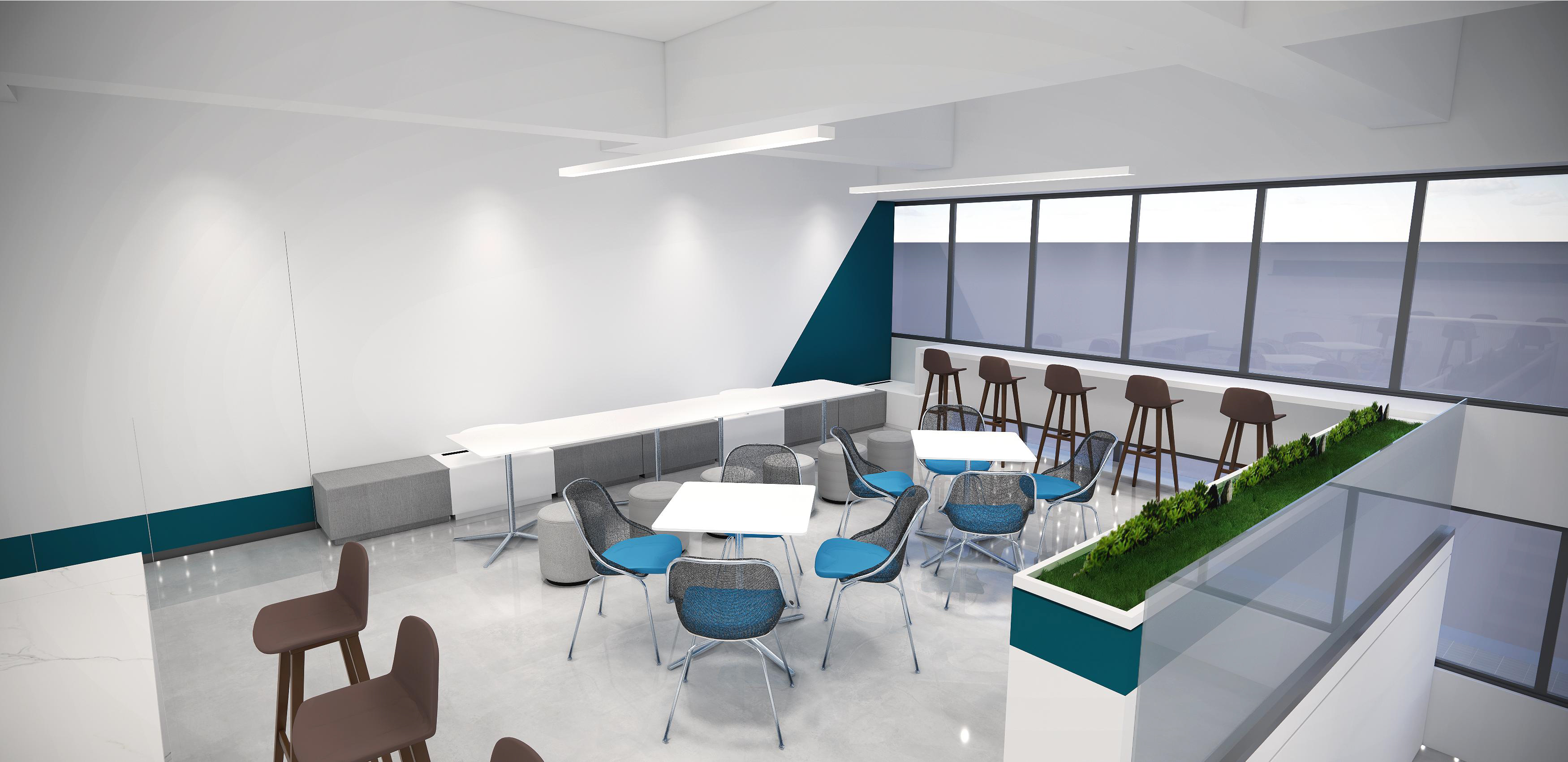 墻面幾何線條的使用,突出現(xiàn)代感,同時增加動感。冷色調墻面強調科技感,開放式布局,空間更加通透、流動。