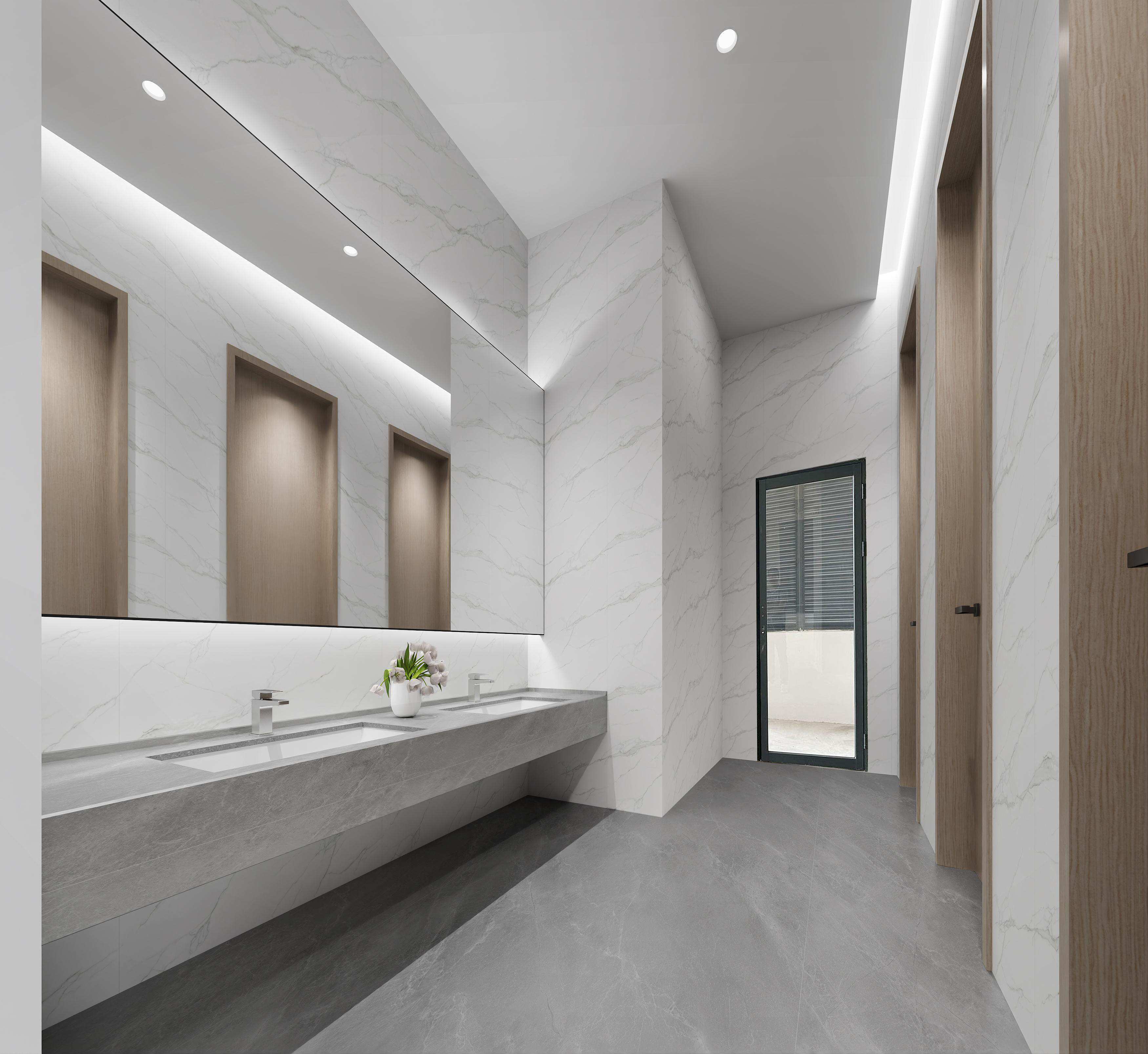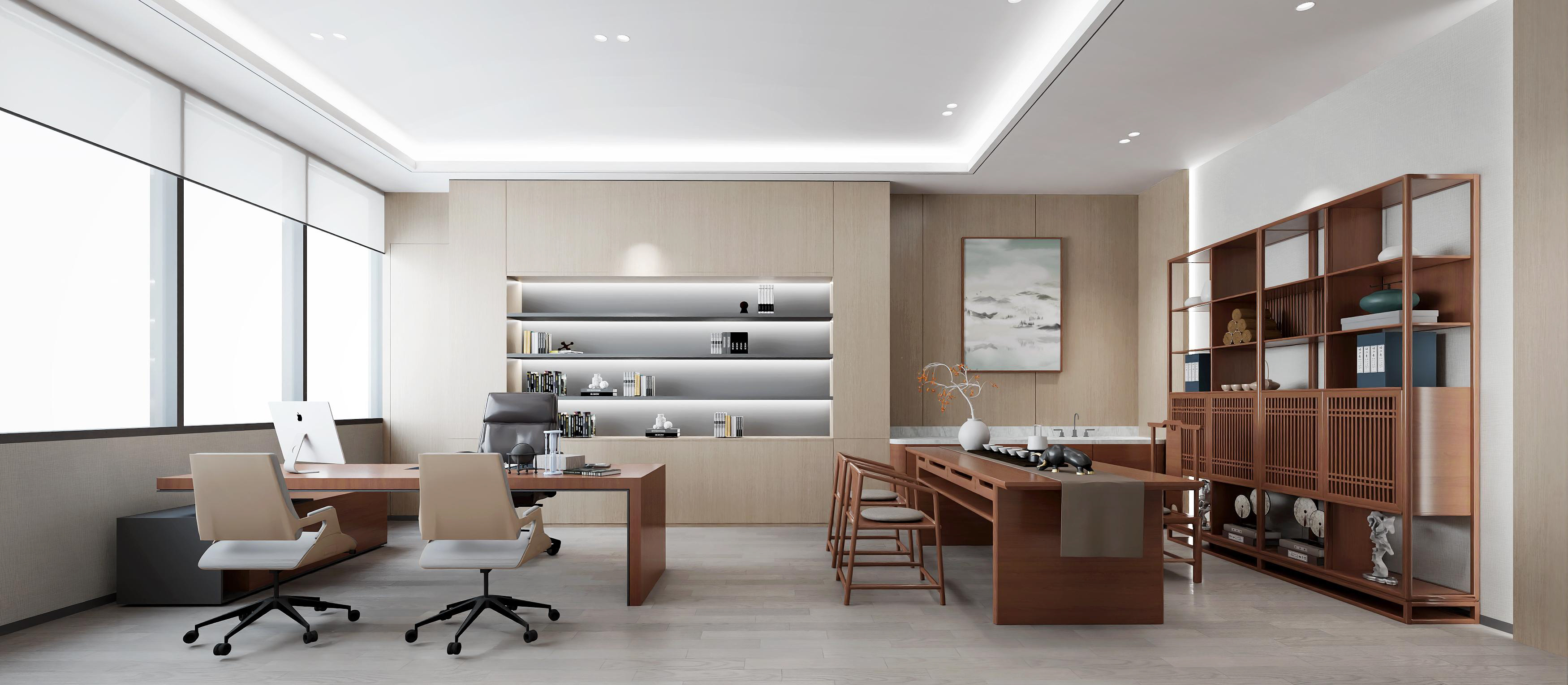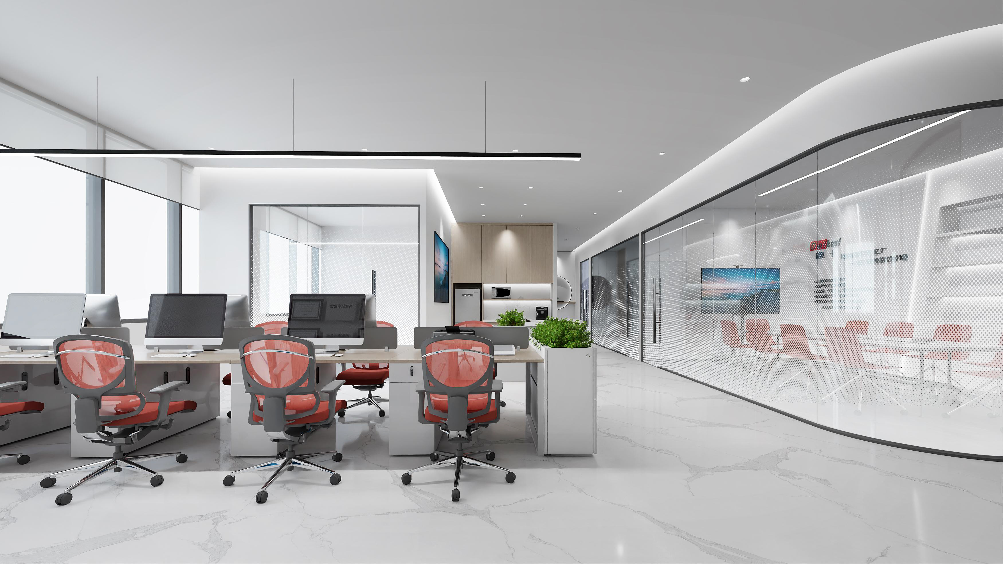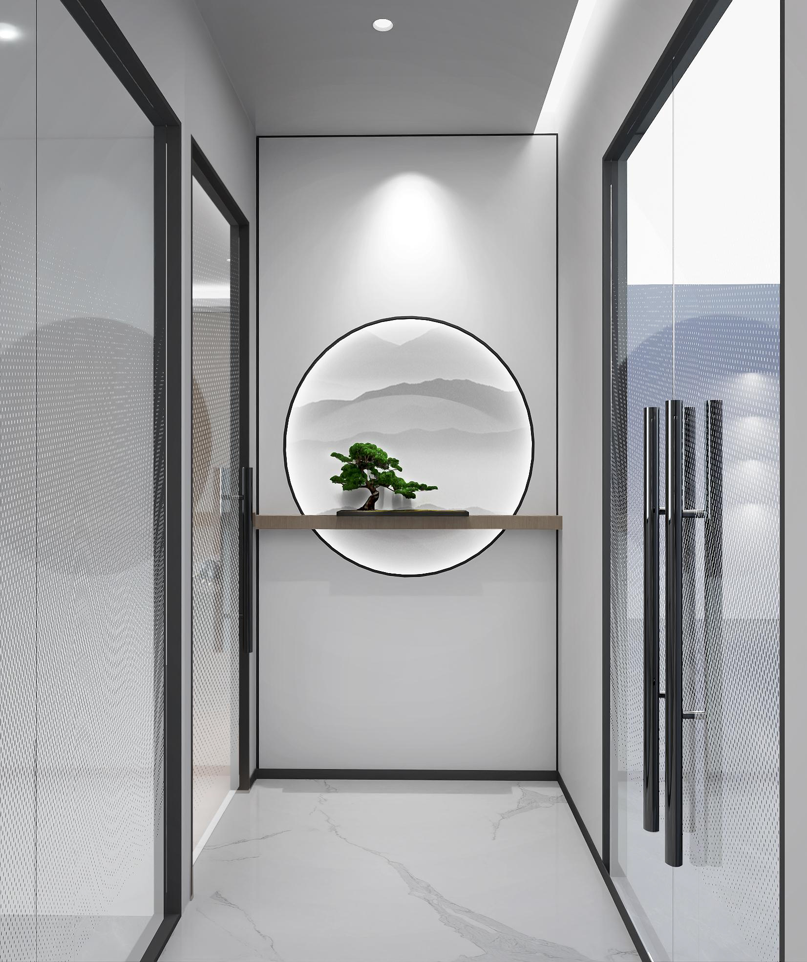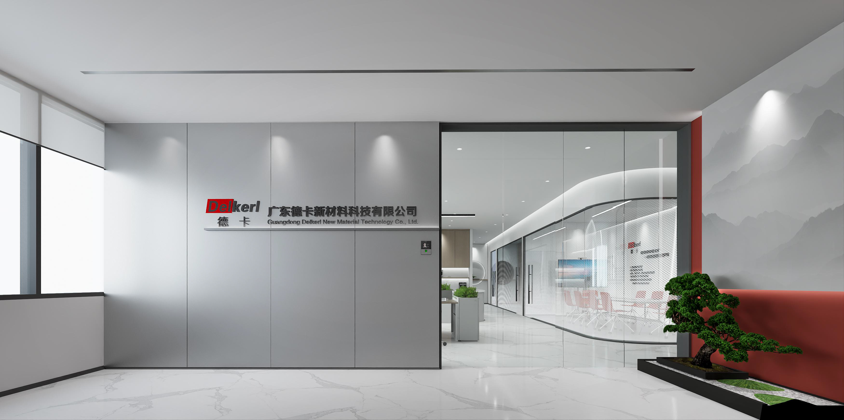 logo墻簡潔明了,節省空間,綠植和墻壁相互映襯,沉穩大氣。整體以灰色調為主,打造簡約風格的同時突出科技感。總經理辦公室中式家具以及其他裝飾物的搭配使用,突顯公司品味。