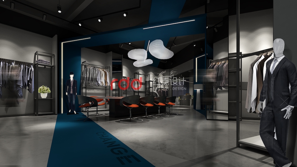 由于是男裝的展廳,整個展廳以灰色為基調,寶藍色的造型如絲帶從地面一直延伸到天花,錯落有致。