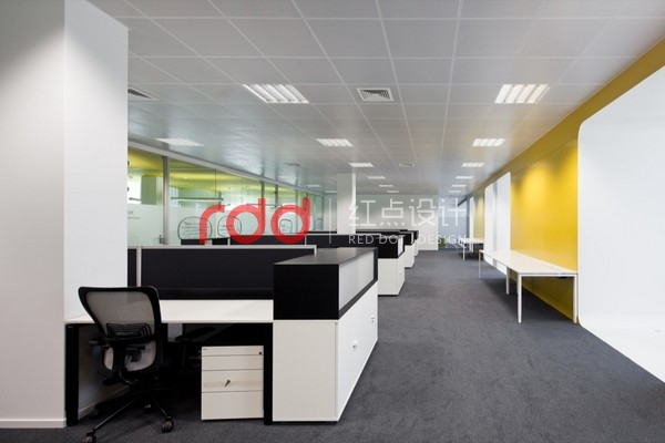 IT行業給人的印象是硬朗的,為了打破這樣的固定思維模式,紅點裝飾的設計師運用黃色及紫色比較柔和的色彩來改變空間的氛圍。線條交錯的白色鏤空隔斷圍合,形成相對獨立的空間。