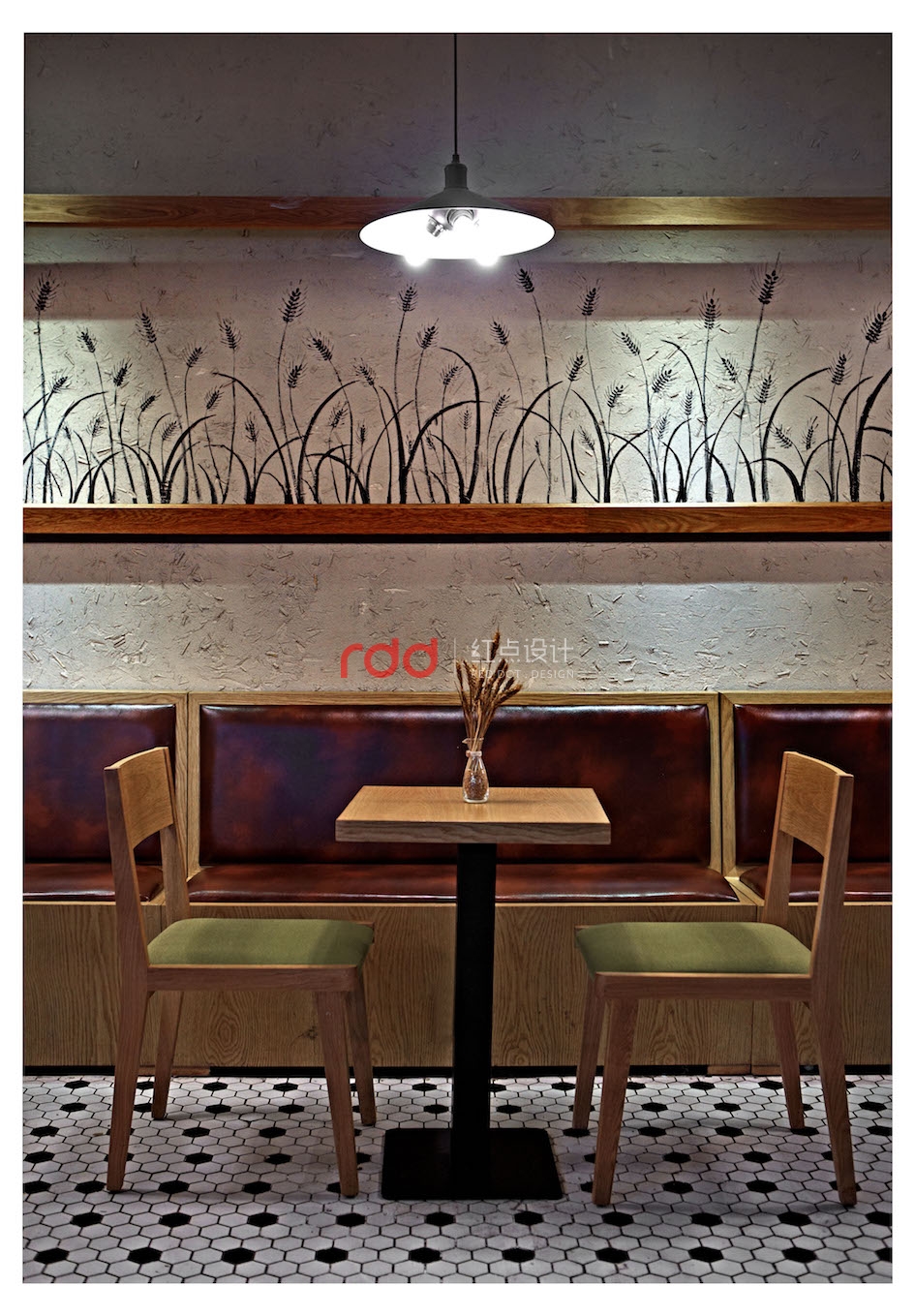 一字排開的桌椅沿著墻面,青草綠色的座椅與墻面麥浪相互映襯,橡木畫框圈起的藝術(shù)墻面回歸原始自然,燈光映射下的麥秸仿佛讓人聆聽到廣袤麥田下孩童嬉戲的笑聲,不管是大廳下的公共空間還是角落里的低吟沉思,麥田下的舒緩心境一直蔓延開來(lái)。
