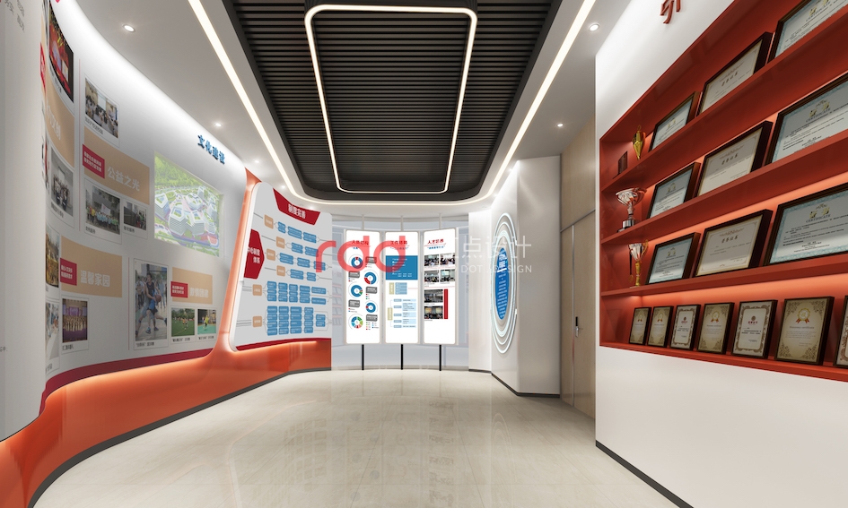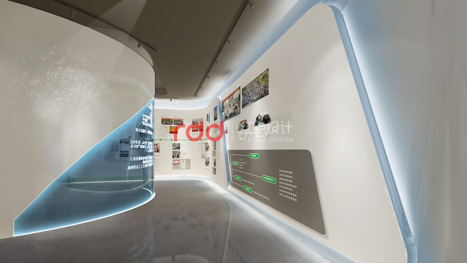企業(yè)的發(fā)展前沿部分,墻面的弧形造型墻從地面一直延伸到天花,螺旋上升,綿延不斷,寓意著企業(yè)發(fā)展的前景、勢頭。
