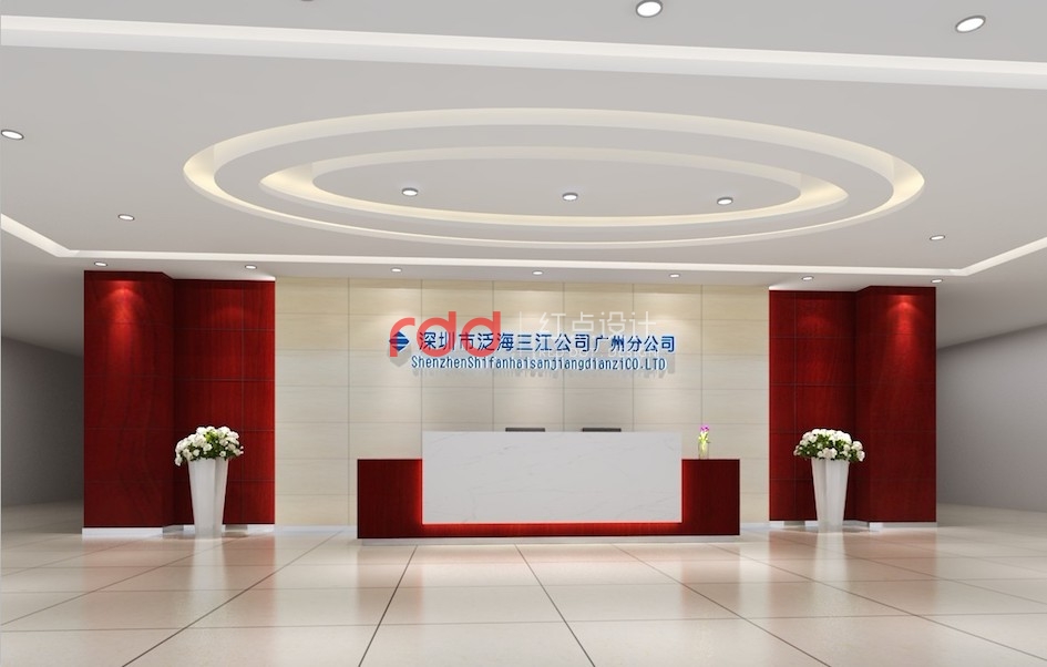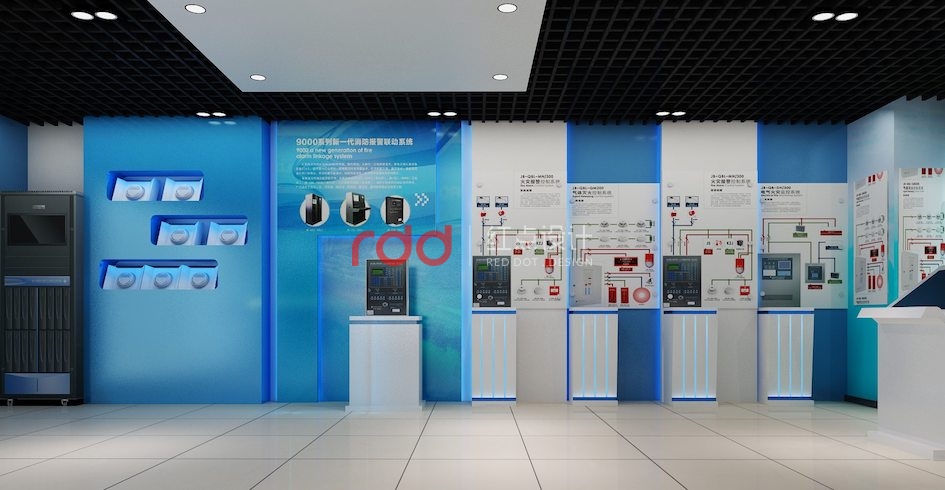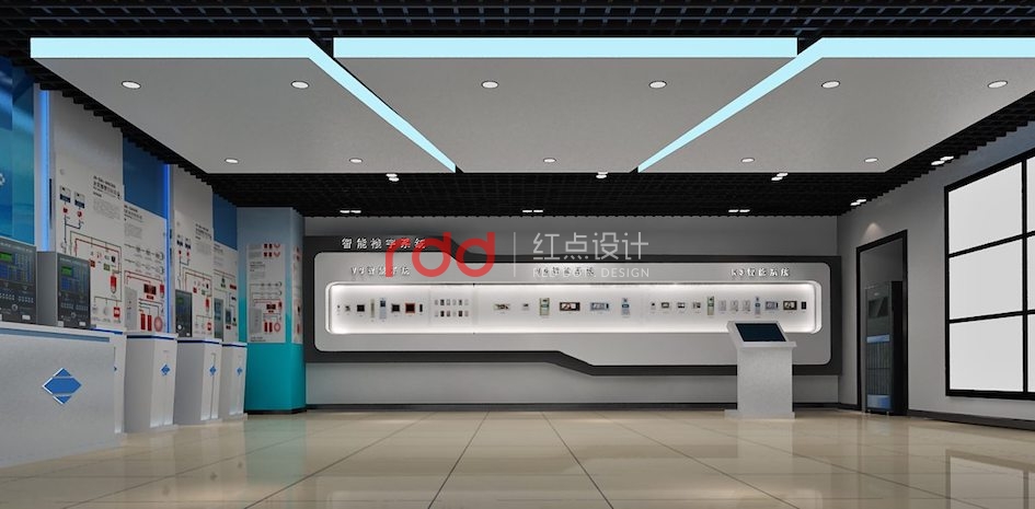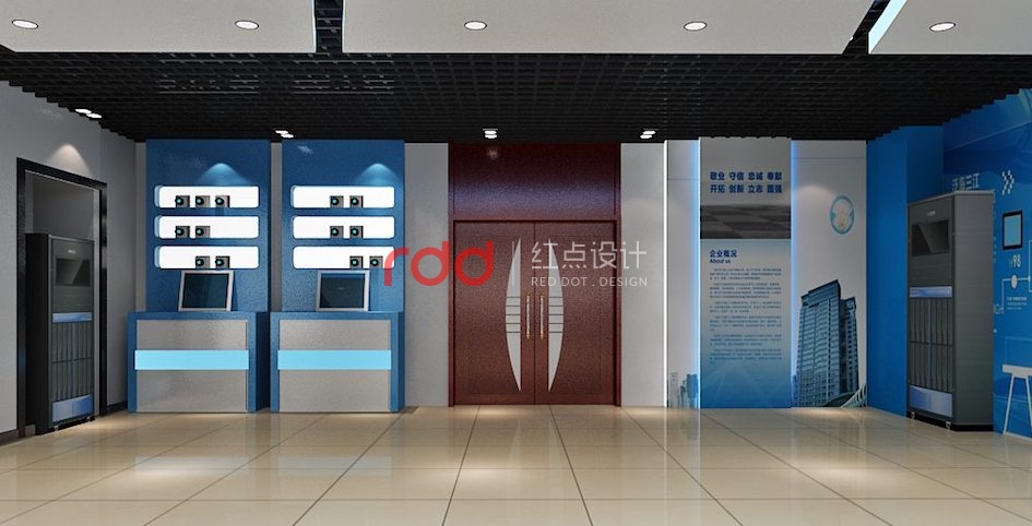 針對該公司從事的產品及業務情況,紅點裝飾的設計師,根據與客戶溝通后的情況,以藍色為主色調,產品尺寸及參觀動線設計展廳的參觀流程。